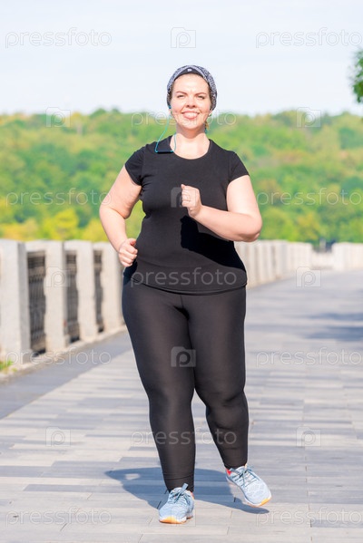 Портрет толстой активной женщины, работающей над своей фигурой - утренний бег в городском парке