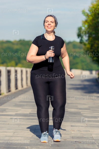 Плюс размер активной женщины с бутылкой воды во время утренней пробежки в городском парке