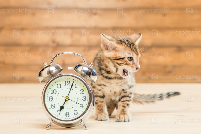 Бенгальская порода котенка и ретро-будильник, который показывает 7 часов