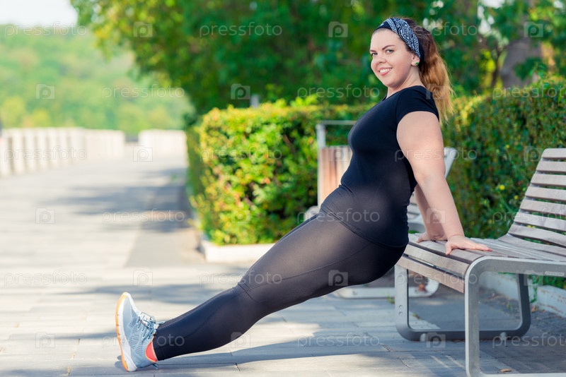 Счастливая толстая женщина выполняет упражнения в парке на скамейке