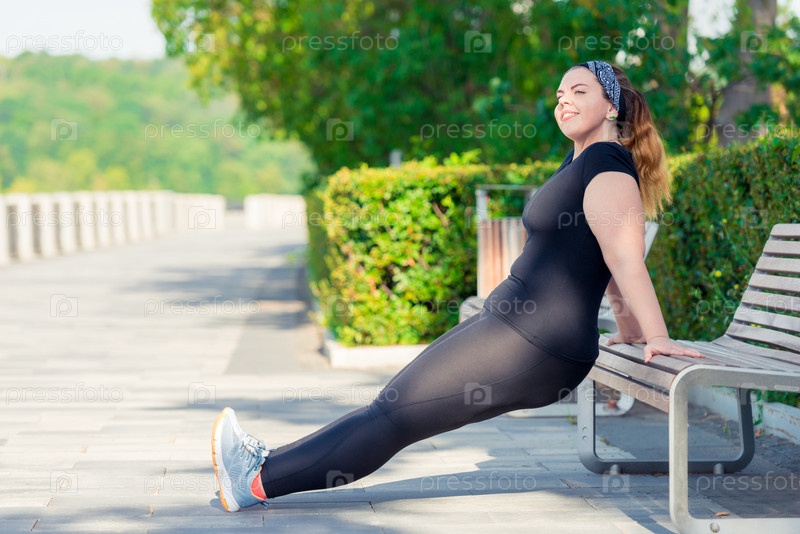 Портрет активной счастливой пухлой женщины выполняет упражнения в парке на скамейке