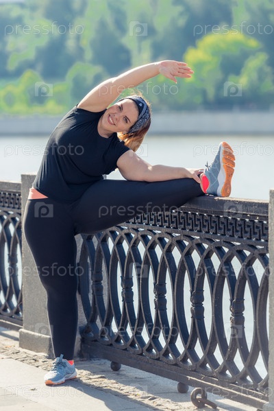 Очень гибкая толстушка выполняет упражнения на набережной в городском парке ранним утром