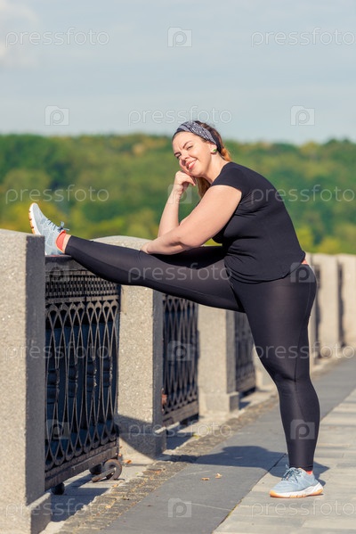 Молодая полная женщина делает упражнения на растяжку на набережной в городском парке ранним утром