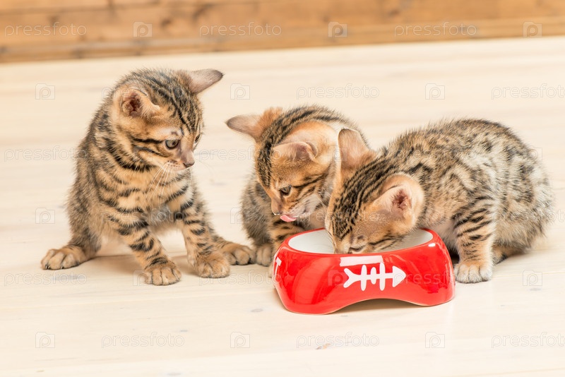 Три бенгальских котята и одна миска молока