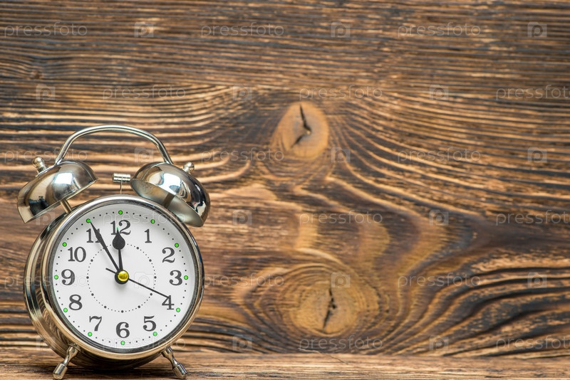 Ретро-будильник на деревянном фоне показывает 12 часов, пространство правильное