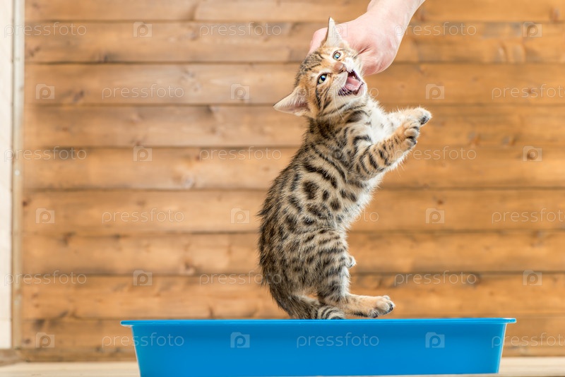 Концептуальная фотография обучения котенка туалетному подносу