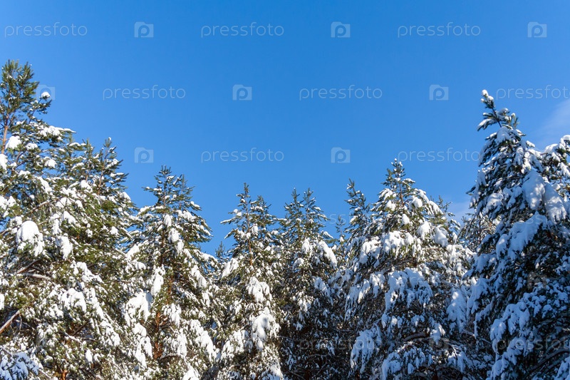 Зимний еловый лес на фоне ярко-голубого неба с копировальным пространством