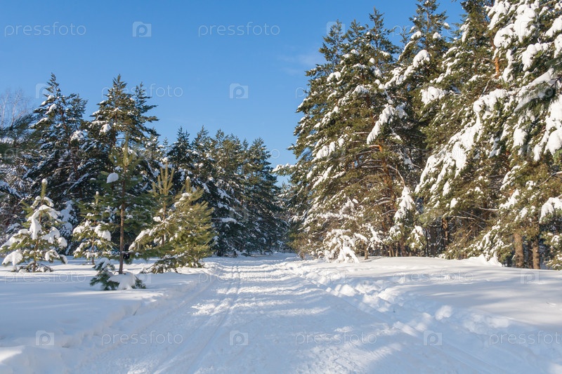 Лыжная трасса в зимнем елочном лесу