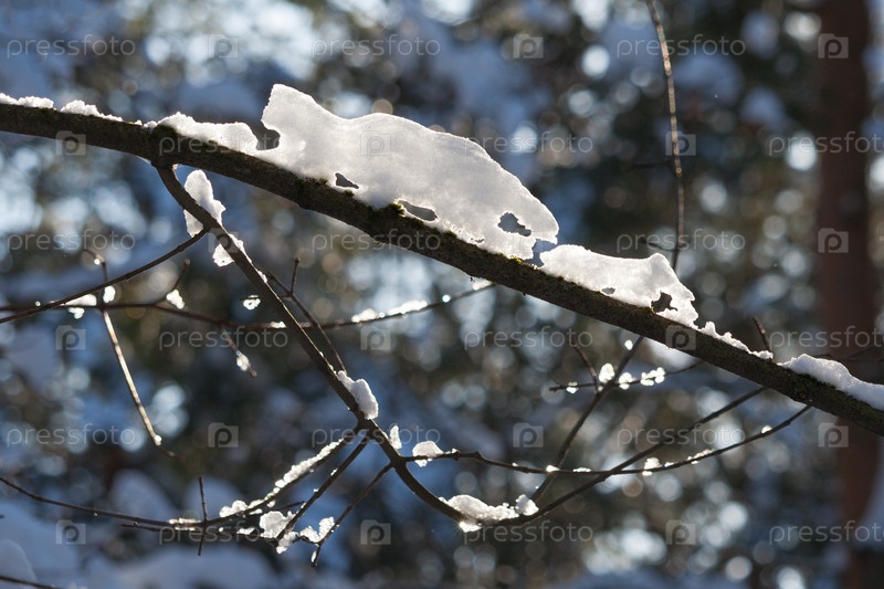 Вид на сухую ветку дерева, покрытую снегом