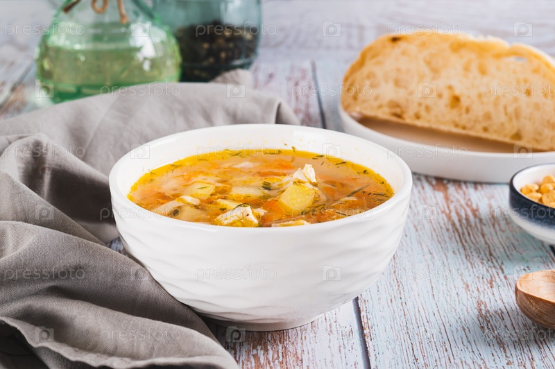 Свежий куриный суп с овощами в миске на столе