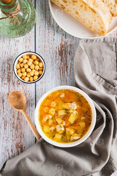 Чаша супа с куриным бульоном, овощами и макаронами сверху и с вертикальным видом