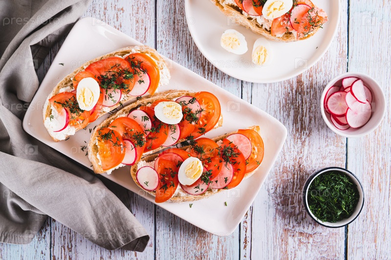 Аппетитная брусчетта с рикоттой, помидорами, редькой и перепелиным яйцом на вид сверху тарелки