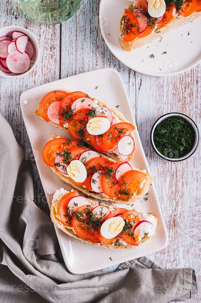 Сэндвичи с рикоттой, помидорами, редькой и яйцом на тарелке на столе и с вертикальным видом
