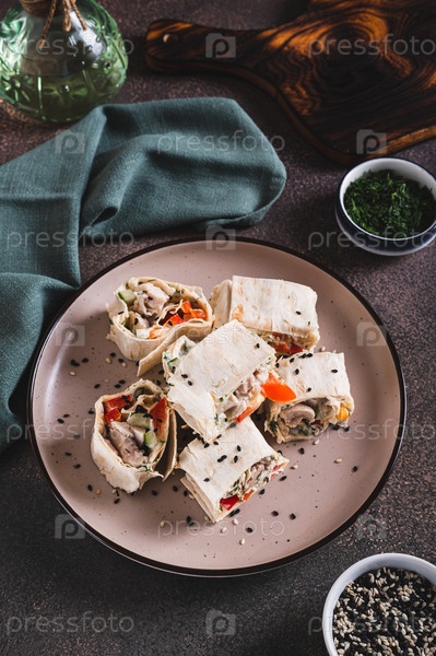 Плоские булочки с курицей и овощами на тарелке на столе вертикальный вид