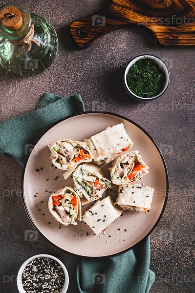 Плоские булочки с курицей и овощами на тарелке на столе и вертикальный вид
