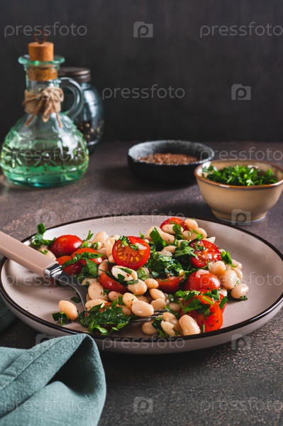 Аппетитный салат из белых бобов, помидоров черри и петрушки на тарелке вертикальный вид