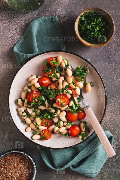 Вегетарианская белая фасоль, томатный и травяной салат на тарелке на столе и вертикальный вид