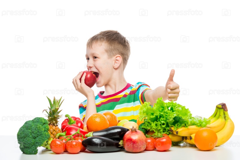 Счастливый мальчик на диете с едой, поедающий красное яблоко сидя за столом