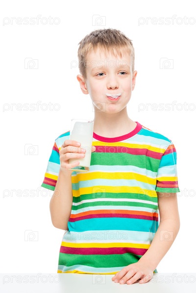 Здоровое питание мальчика со стаканом молочного напитка на белом фоне