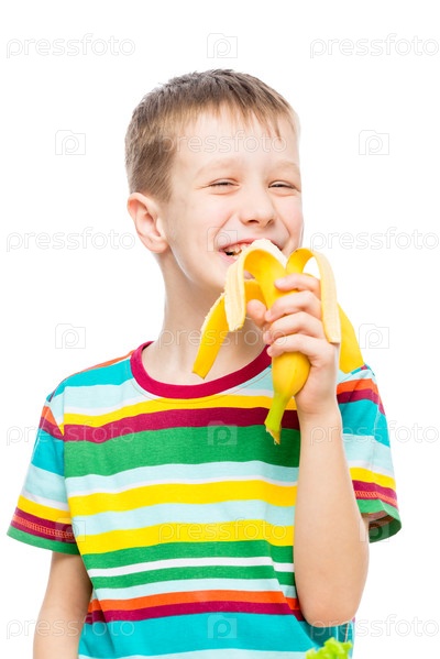 Вертикальный портрет мальчика, который ест вкусный банан на белом фоне, портрет изолирован