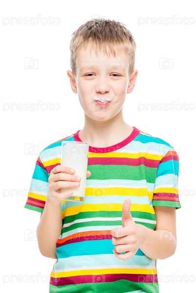 Здоровый мальчик и здоровый вкусный молочный напиток, портрет изолированный