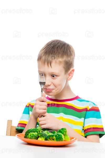 Портрет мальчика с тарелкой брокколи, съемка на белом фоне изолирована