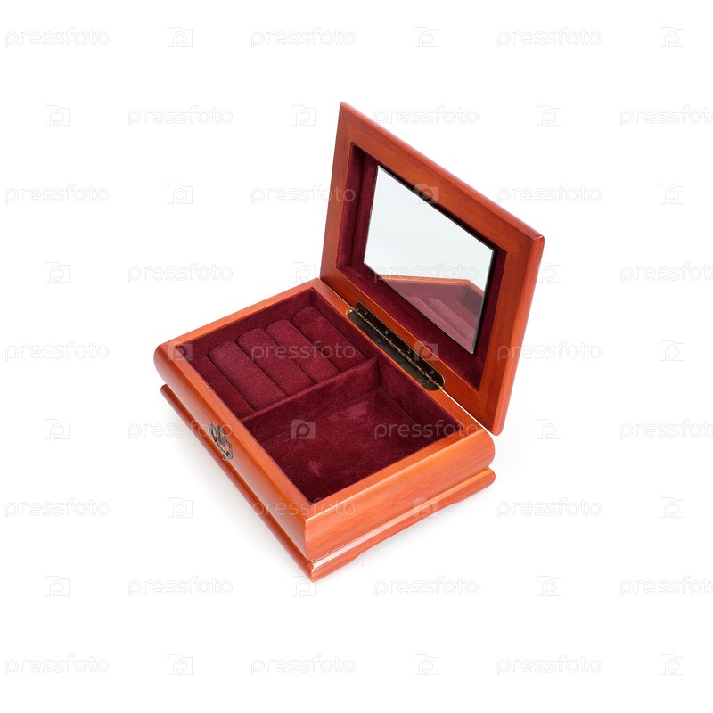 Деревянная коробка для хранения ювелирных изделий изолирована на белом фоне