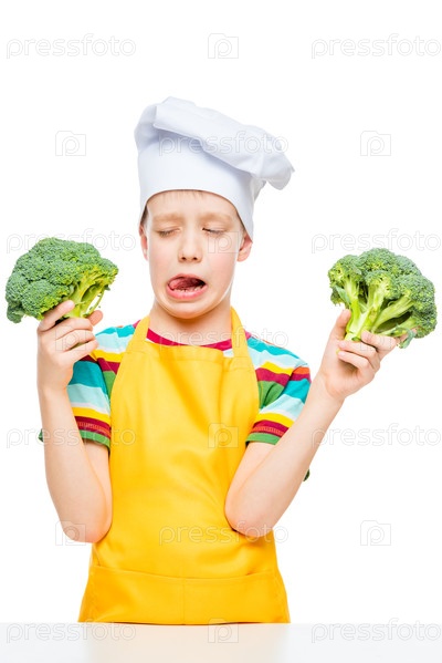 Вертикальный портрет мальчика, который не любит брокколи в кепке повара на белом фоне