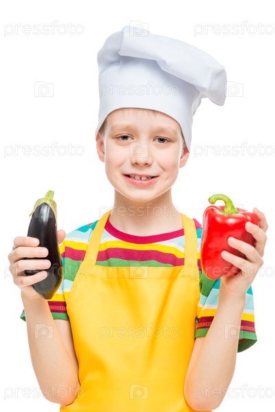 Вертикальный портрет ребенка в поварской шляпе с перцем и баклажаном на белом фоне