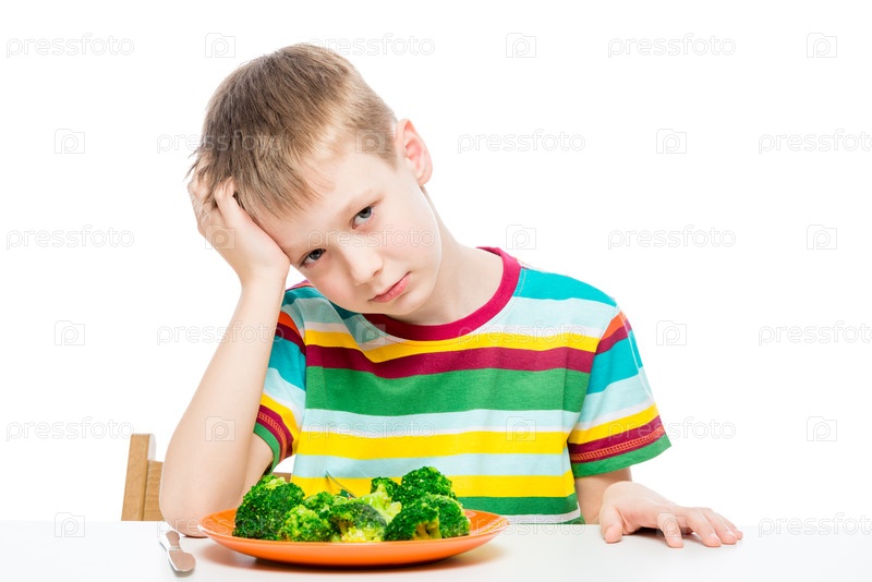 Печальный ребенок с тарелкой брокколи за столом, портрет изолированный