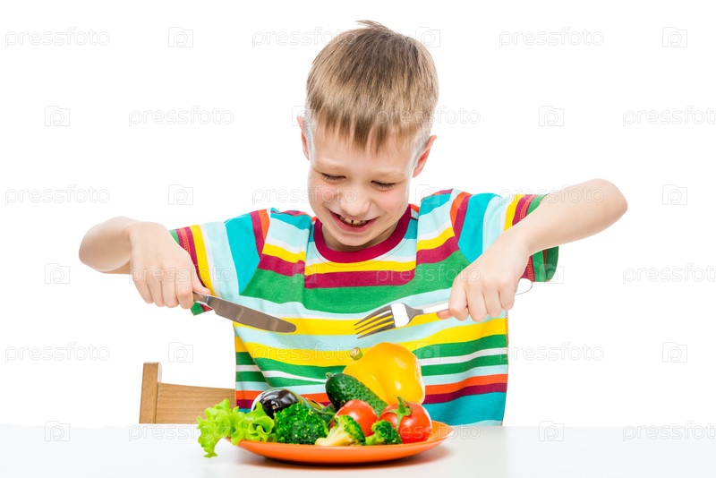 Голодный мальчик 10 лет с тарелкой овощей, концепт-фото диета и здоровое питание