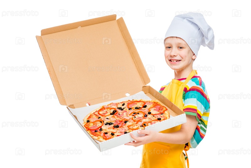 Портрет ребенка, готовящего в кепке с пиццей в коробке на белом фоне в студии