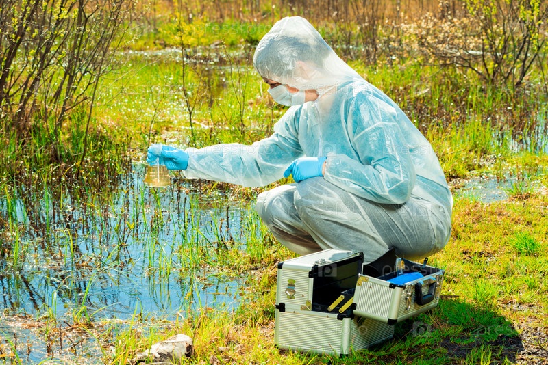 Эколог на берегу лесного озера берет пробы воды после экологической катастрофы