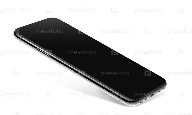 Под углом черный смартфон с черным пустым экраном и металлической серой рамкой на белом фоне