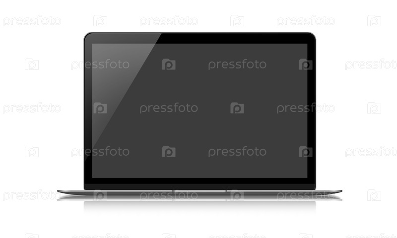 Открыт современный черно-серый ноутбук с пустым черным экраном на белом фоне