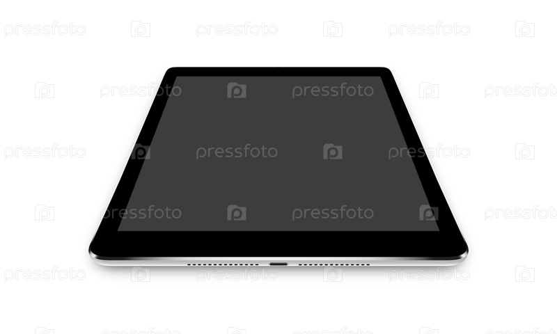 Черно-серый планшет под углом с пустым черным экраном, изолированным на белом фоне