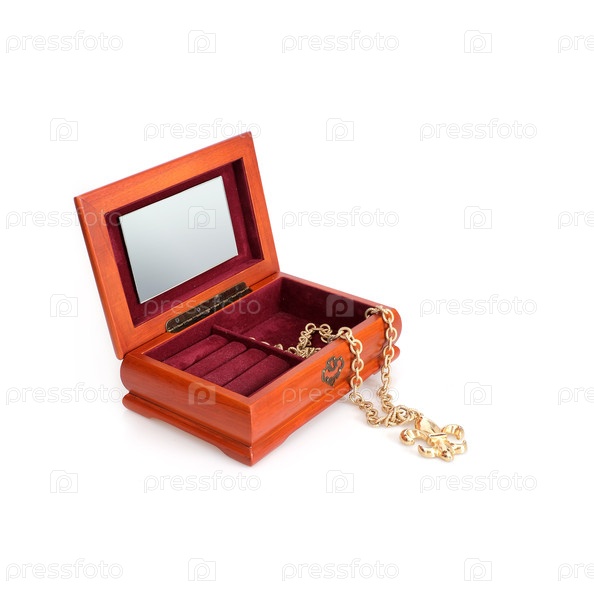 Деревянная коробка для хранения ювелирных изделий изолирована на белом фоне