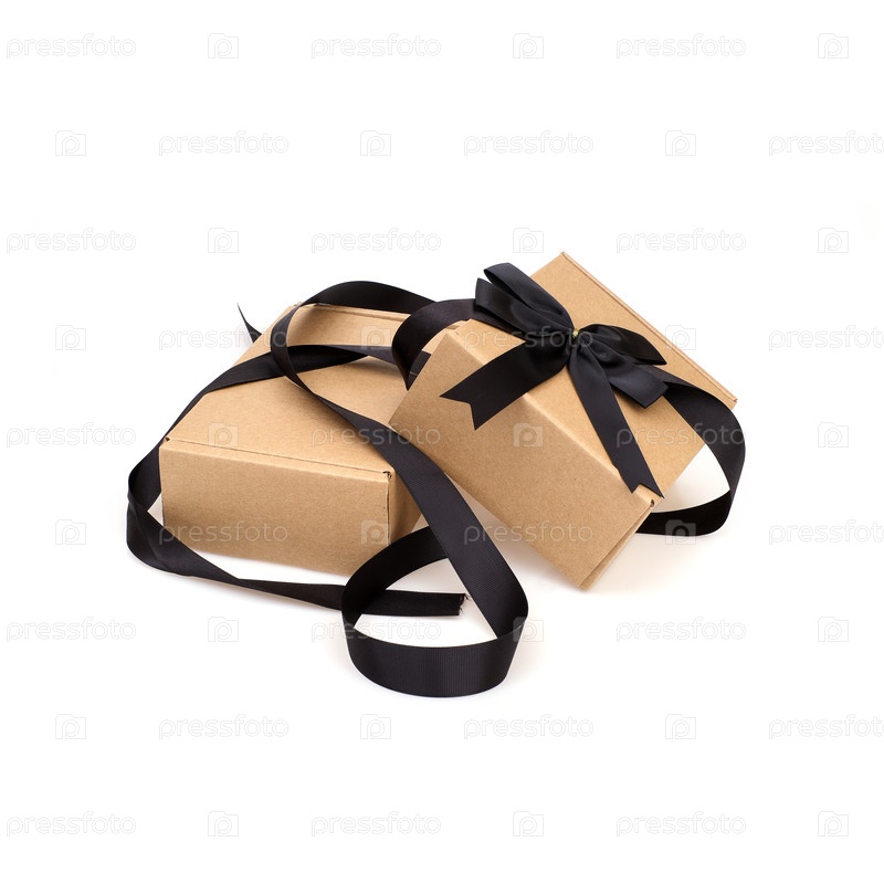 Две коробки с черным луком и лентой, изолированные на белом фоне