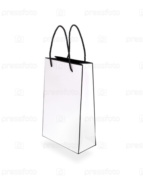 Белый бумажный пакет, выделенный на белом фоне. Элемент дизайна с обрезкой пути