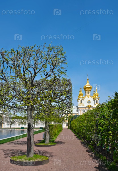 Петродворец (Петергоф, Санкт-Петербург, Россия). Весенний вид на Большой дворец и церковное крыло из Верхнего парка