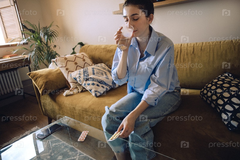 Усталая молодая женщина сидит на диване и принимает лекарства с водой. Больная девушка в повседневной одежде испытывает боль и принимает таблетки