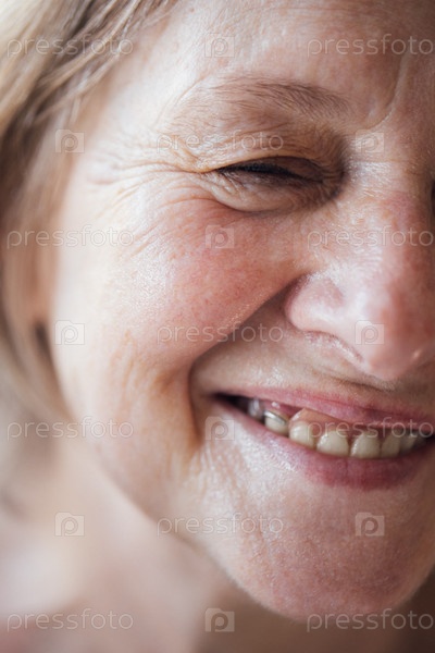 Пожилая женщина смеется. Лицо улыбающейся пенсионерки с морщинами на лице и без макияжа