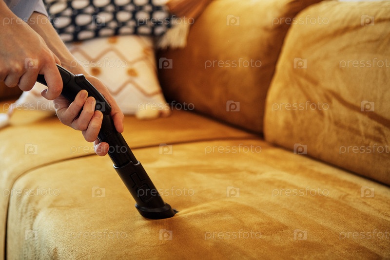 Закройте женские руки всасывающей щеткой, пылесосящей обивку дивана. Женщина убирает диван с помощью пылесоса и насадки для мягкой мебели