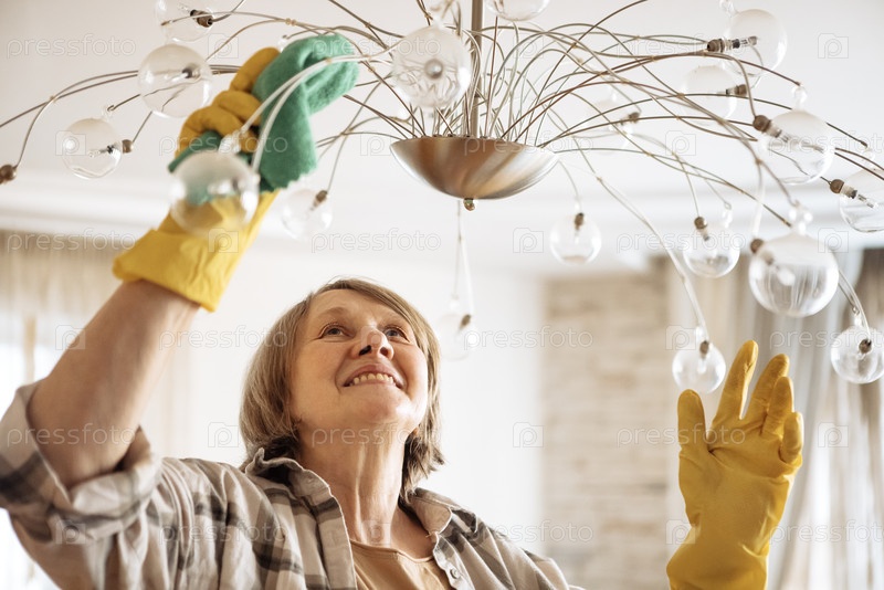 Пожилая женщина в повседневной одежде стирает люстру в гостиной. Зрелая женщина в очках убирает дом