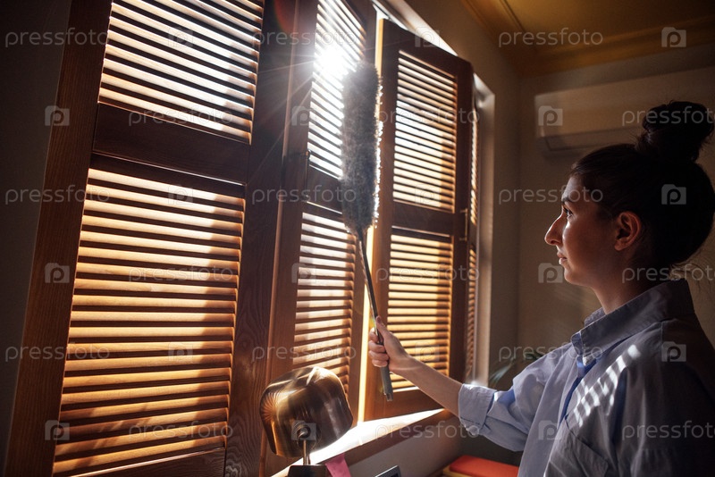 Молодая женщина в синей рубашке пылит деревянными жалюзи пылесосом. Девушка в повседневной одежде держит пылевую щетку. Студент убирает дом