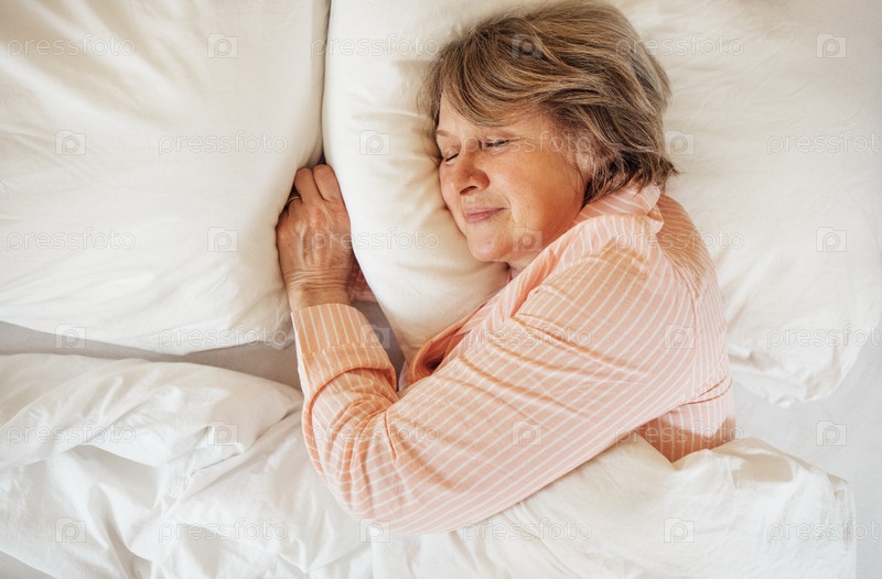Пожилая женщина держит руку под щекой и спит в постели