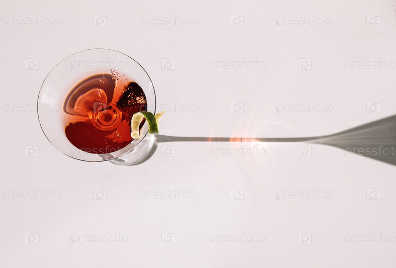Замкнутый бокал мартини на белом столе. Элегантный кубок с красным алкогольным игристым напитком