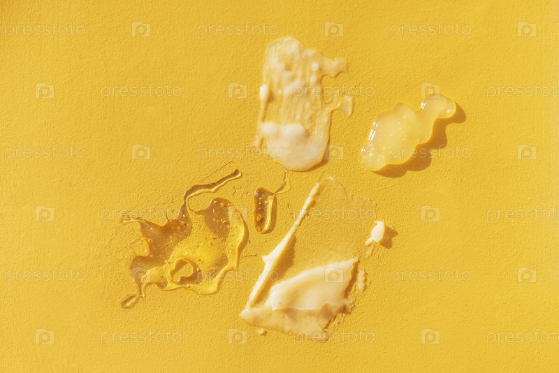 Разная текстура геля и крема на желтом фоне. Прозрачная и белая сыворотка с каплями