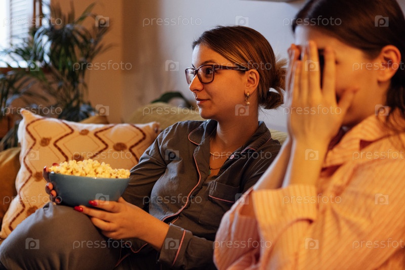 Девушки в пижаме сидят на диване и смотрят телевизор. Милые друзья веселятся вместе и смотрят фильмы ужасов. Подростки едят попкорн на диване