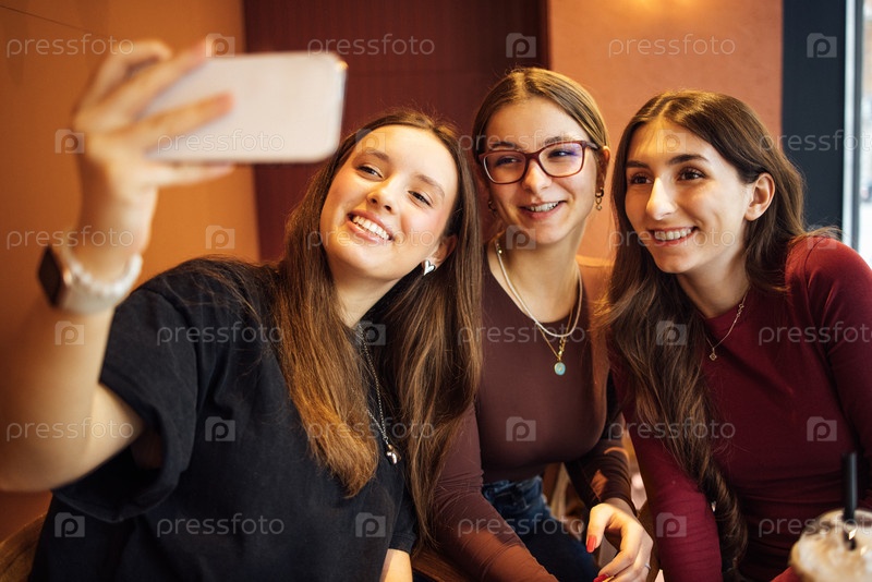 Три милые девушки улыбаются и делают селфи. Беззаботные друзья в повседневной одежде тусуются в кафе. Счастливые студенты фотографируются вместе